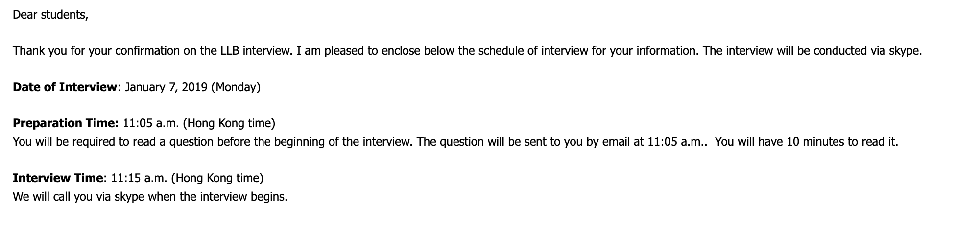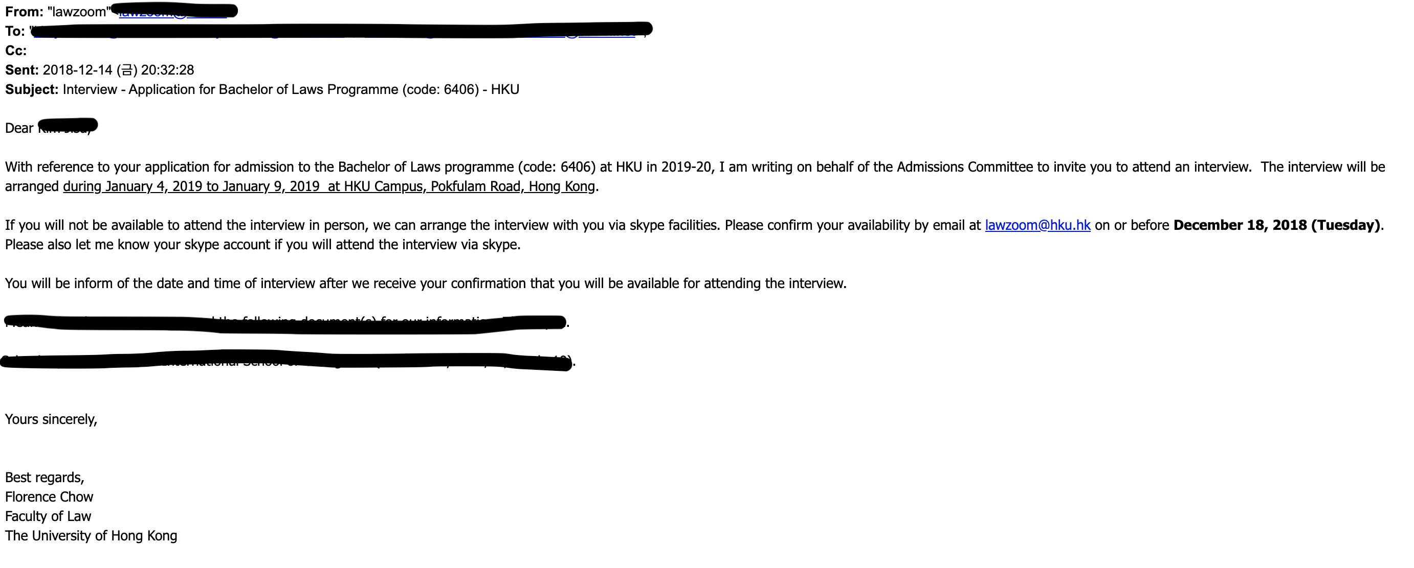 우선 저는 홍콩대 법학과(Faculty of Law)에 지원하였었습니다. 인터뷰로는 제게 두 가지 옵션을 주셨는데요, HKU Campus로 직접 방문하는 것과 Skype 인터뷰로 대신하는 것이였습니다. 당시 저는 학교일로 많이 바빴기 때문에 스카이프로 진행하기를 요청했고 대학 측에서 흔쾌히 승낙해 주었습니다.